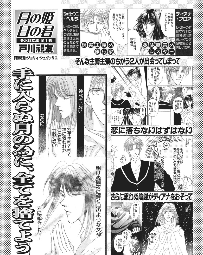 舞台は百年戦争末期の南フランス、『月の僧院』。 「月の女神」と呼ばれる、恋は厳禁の尼僧・ディアナと、 神を信じない現実主義の銀行家・ジョヴァンニ。 こんな主義主張の異なる二人が出逢ったら、恋に落ちないはずはない!? 戸川視友が贈るロマンティック・ラブ、待望の文庫化。 愛を信じる事ができない少女オランジュの恋と復讐を描く 「ジョリィ・シュヴァリエ」も同時収録。