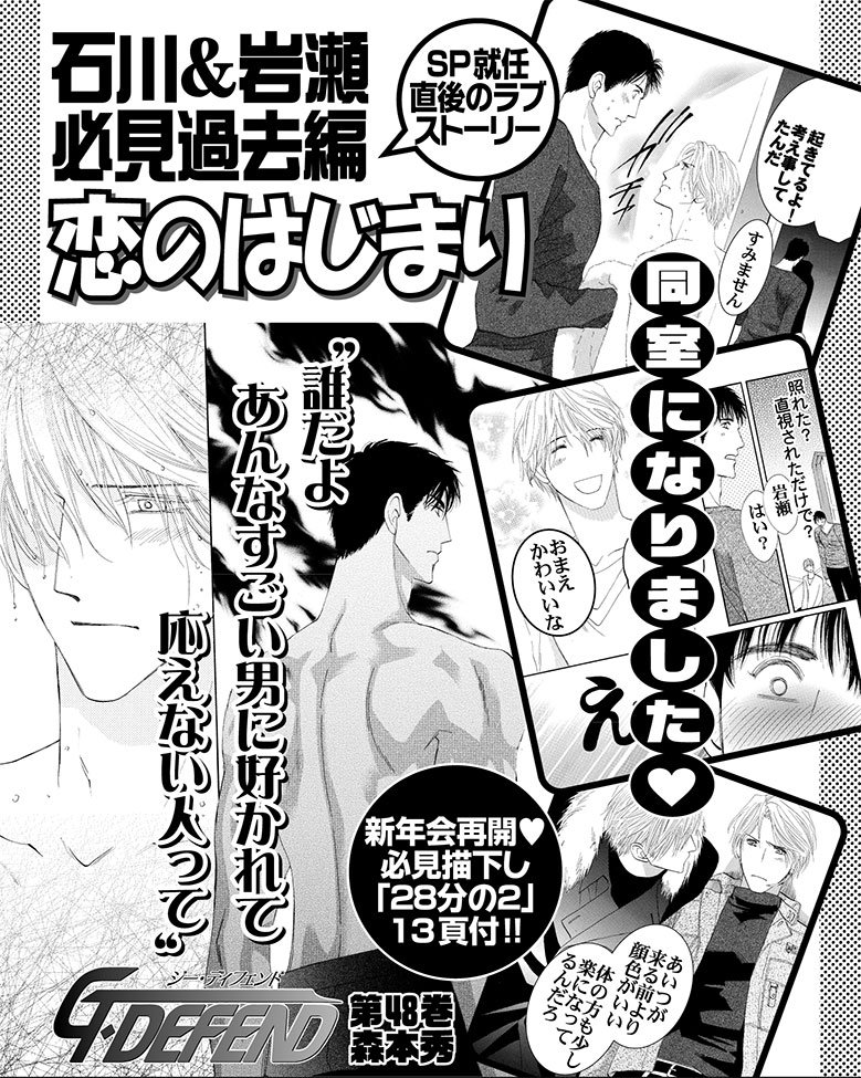 国会警備隊隊長・石川とSP・岩瀬の近未来ラブ&アクション!! 石川&岩瀬・恋がはじまる必見過去編登場♪ 2人が同室になってからの初めて尽くしのエピソード「ふたりの距離」&「近距離恋愛」を収録!! 新年会再開の描下し「28分の2」13Pも必見!!