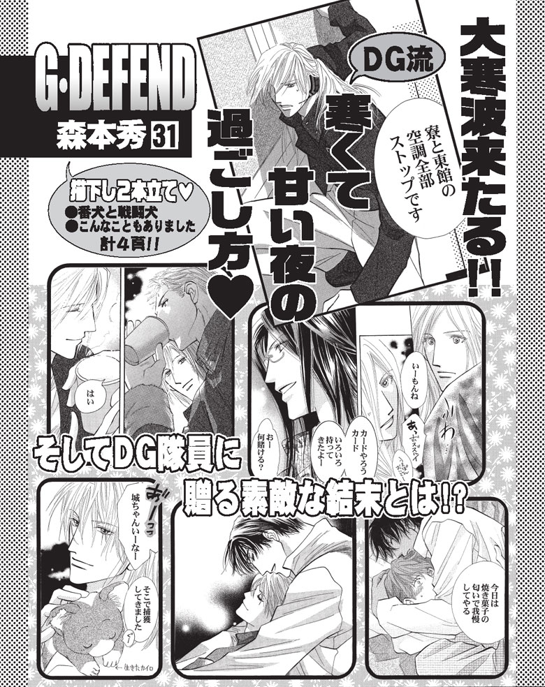 国会警備隊隊長・石川とSP・岩瀬の近未来ラブ&アクション。DG流・寒くて甘い夜を描いた「それは寒かった日のこと」、ロイド兄弟来日編、隊長+お酒=パニック必至!?の「WANTED」、同期達の配属秘話「後に続く者達へ」を収録。「番犬と戦闘犬」など番外編計4頁も必見!