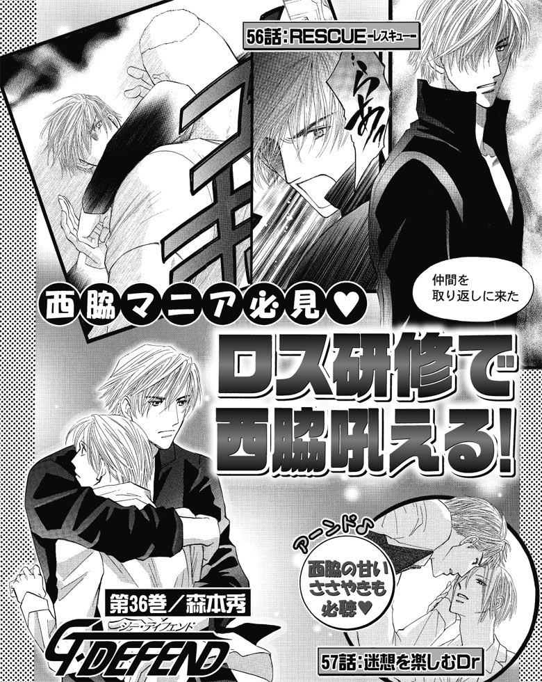 国会警備隊隊長・石川とSP・岩瀬の近未来ラブ&アクション第36巻。訓練校時代のロス研修で石川を守って西脇が吼える『RESCUE』と、西脇&Drの愛が深まる『迷想を楽しむDr』、真矢&宇崎の番外編『My favorite』6Pも収録!!