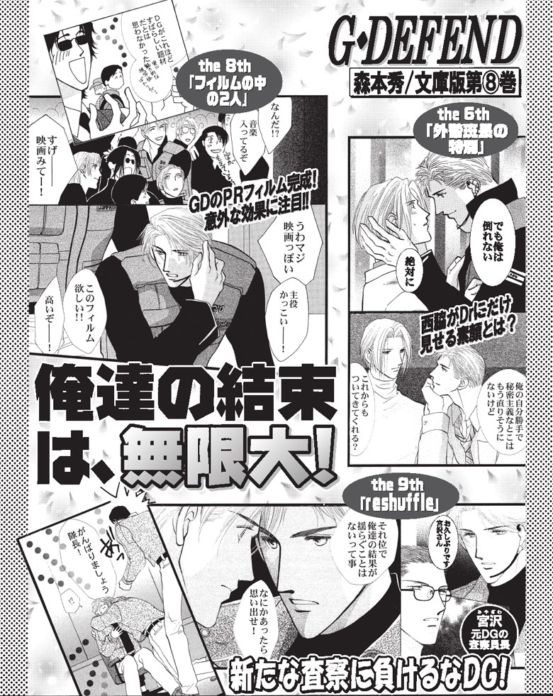 国会警備隊教官・石川とSP・岩瀬の近未来ラブ&アクション第8巻。ロスからの研修隊員が石川にアプローチ!?の「悠争奪戦」、西脇&Drメインの「外警班長の特別」、DGのPRフィルム制作中にトラブルあり!?の「フィルムの中の2人」など5話を収録!